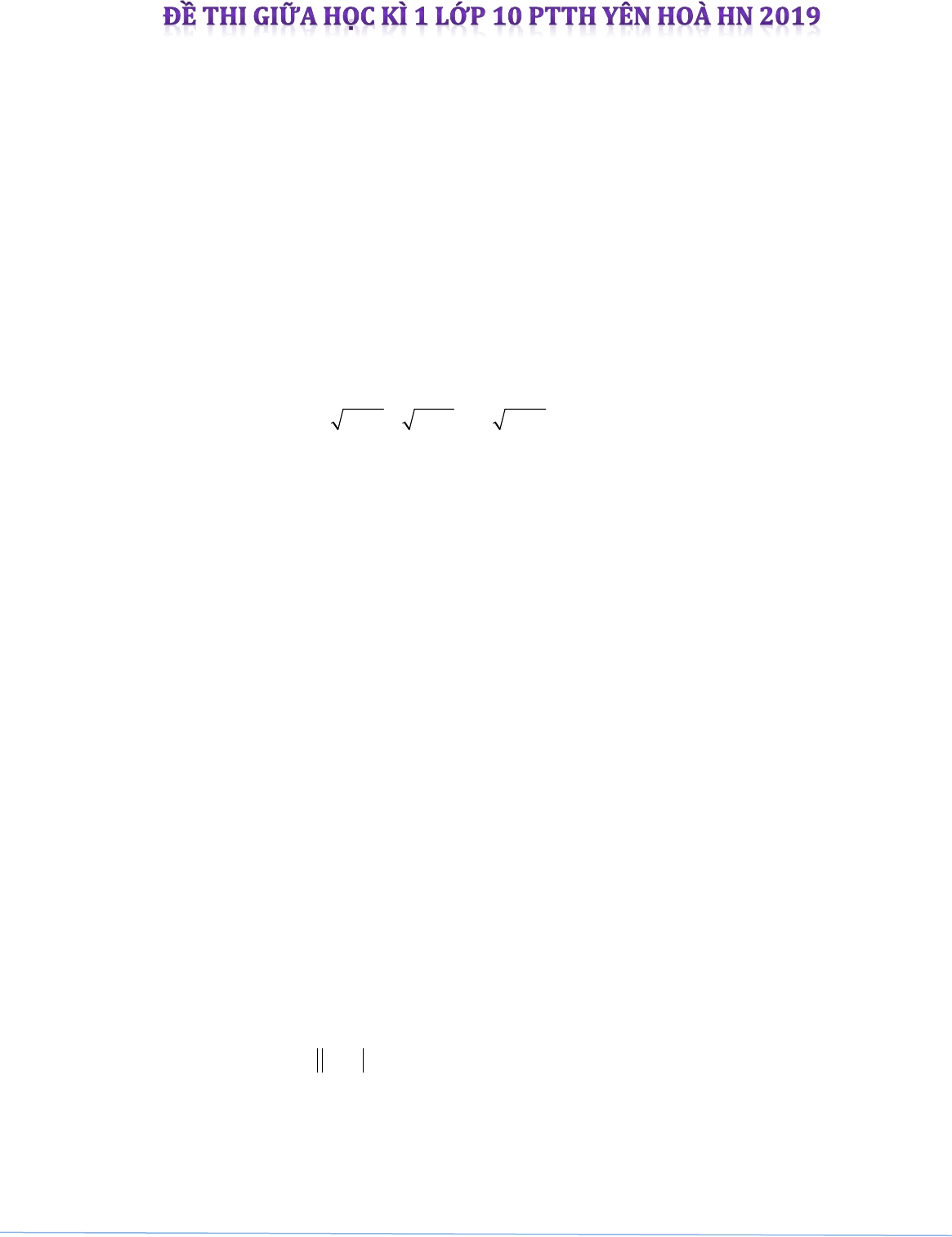 Đề thi giữa học kì 1 Toán 10 năm 2018 - 2019 trường THPT Yên Hòa - Hà Nội