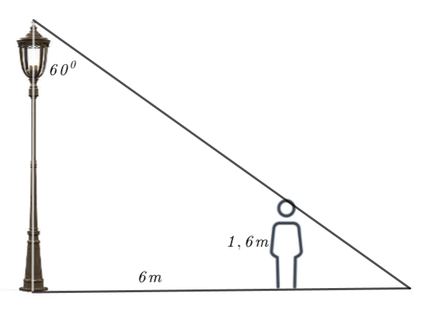 Một học sinh đứng cách cột đèn 6m, cột đèn tạo với đoạn nối điểm cao nhất của cột đèn và điểm cao nhất của học sinh một góc