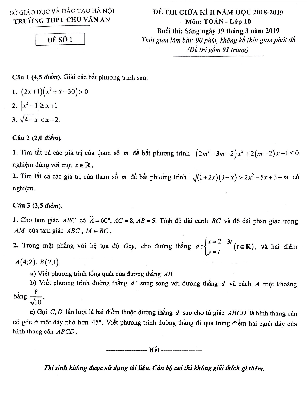 Đề thi giữa học kì 2 lớp 10 môn Toán năm 2018 - 2019 trường THPT Chu Văn An - Hà Nội