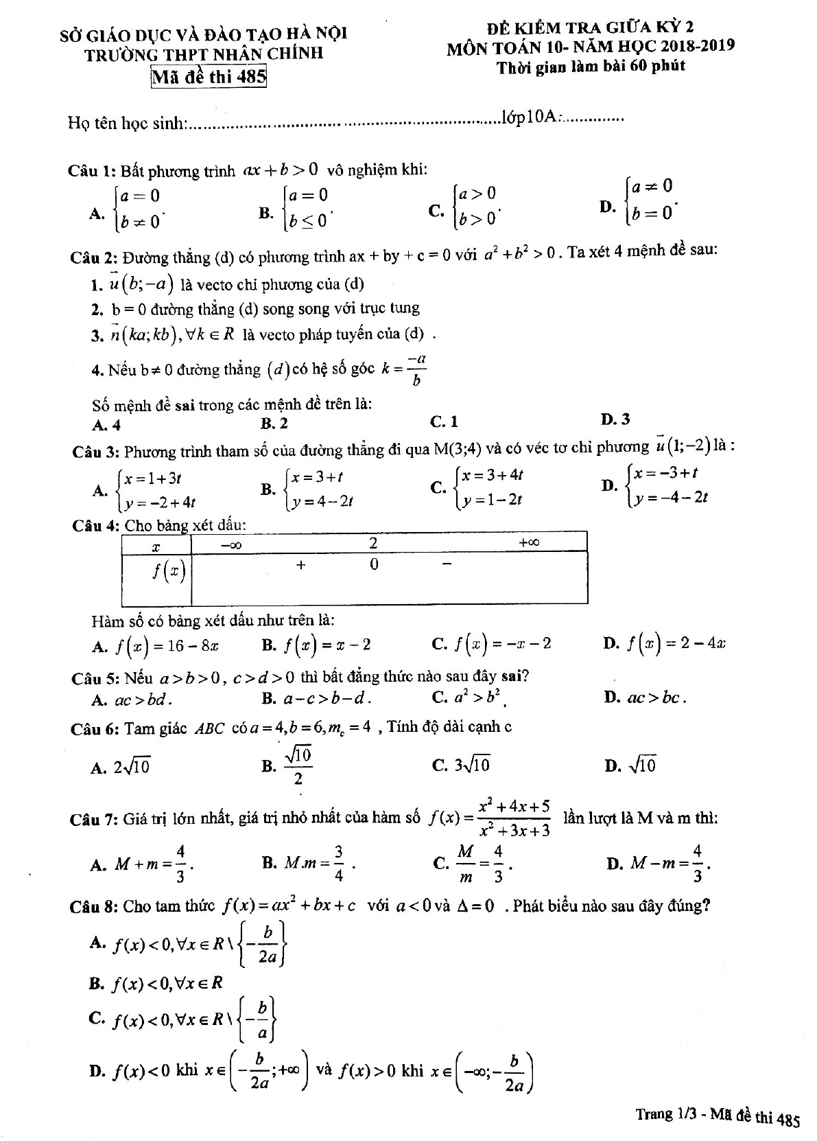 Đề thi giữa học kì 2 lớp 10 môn Toán năm 2018 - 2019 trường THPT Nhân Chính - Hà Nội