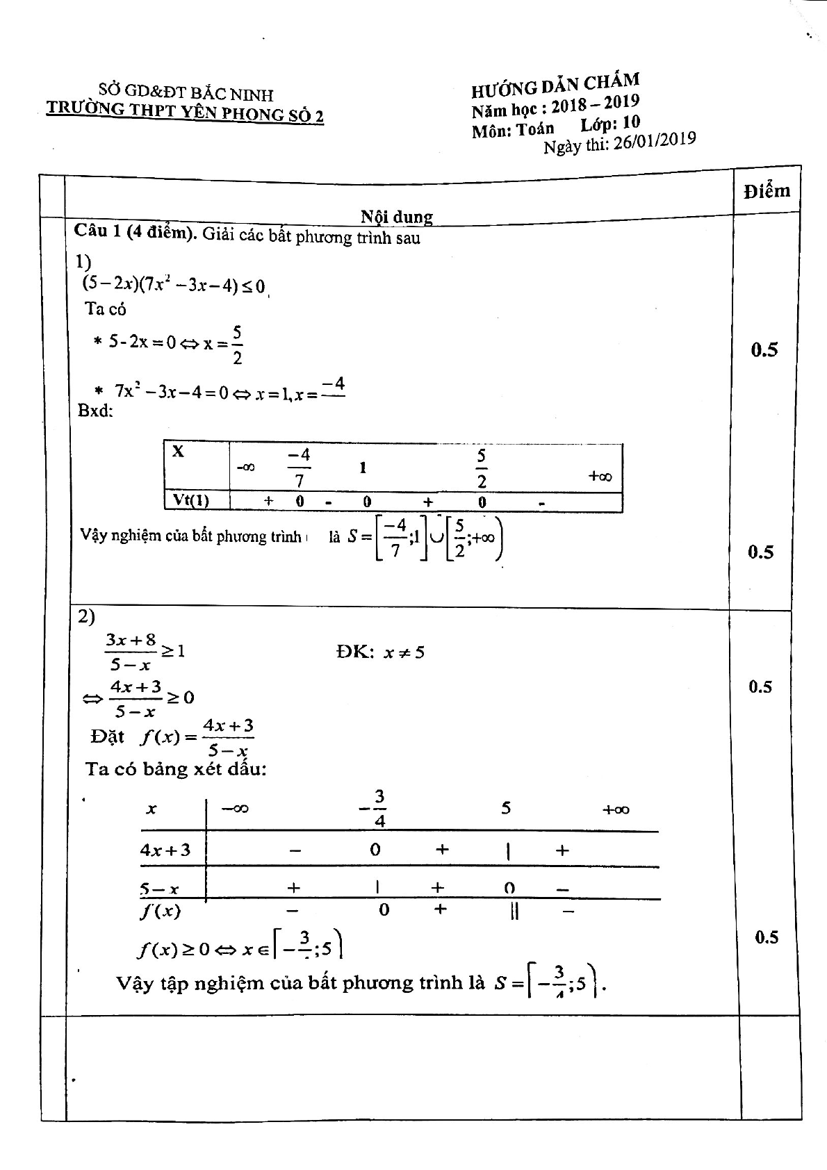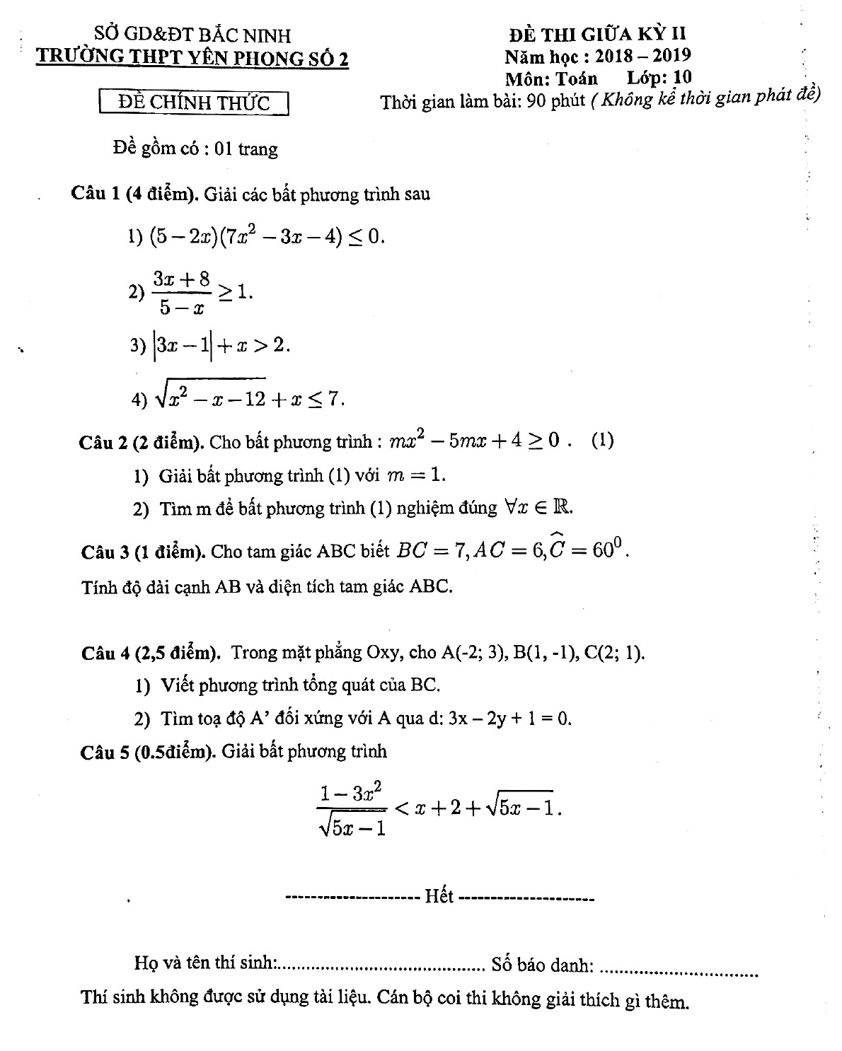 Đề thi giữa học kì 2 lớp 10 môn Toán năm 2018 - 2019 trường THPT Yên Phong 2 - Bắc Ninh