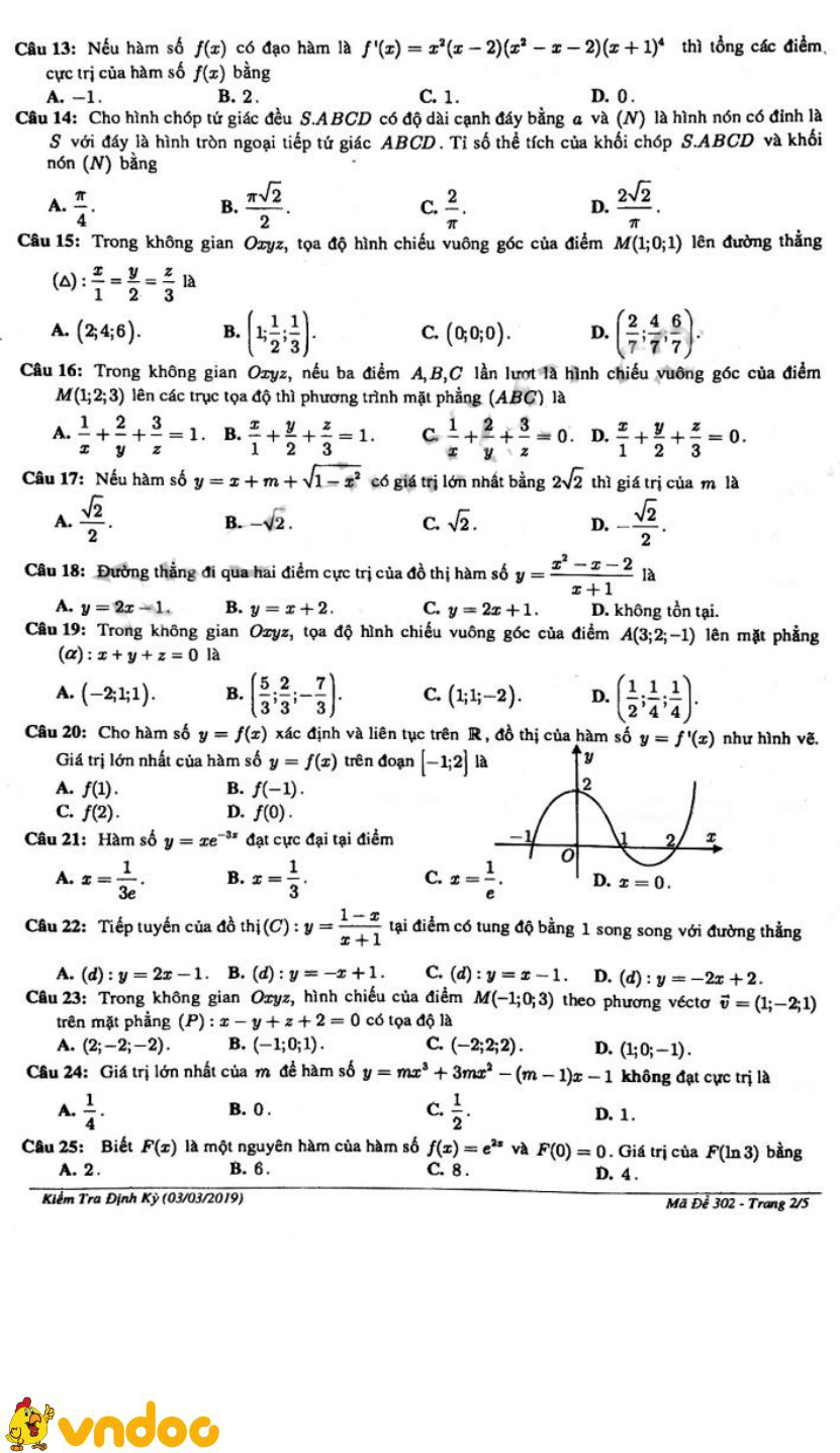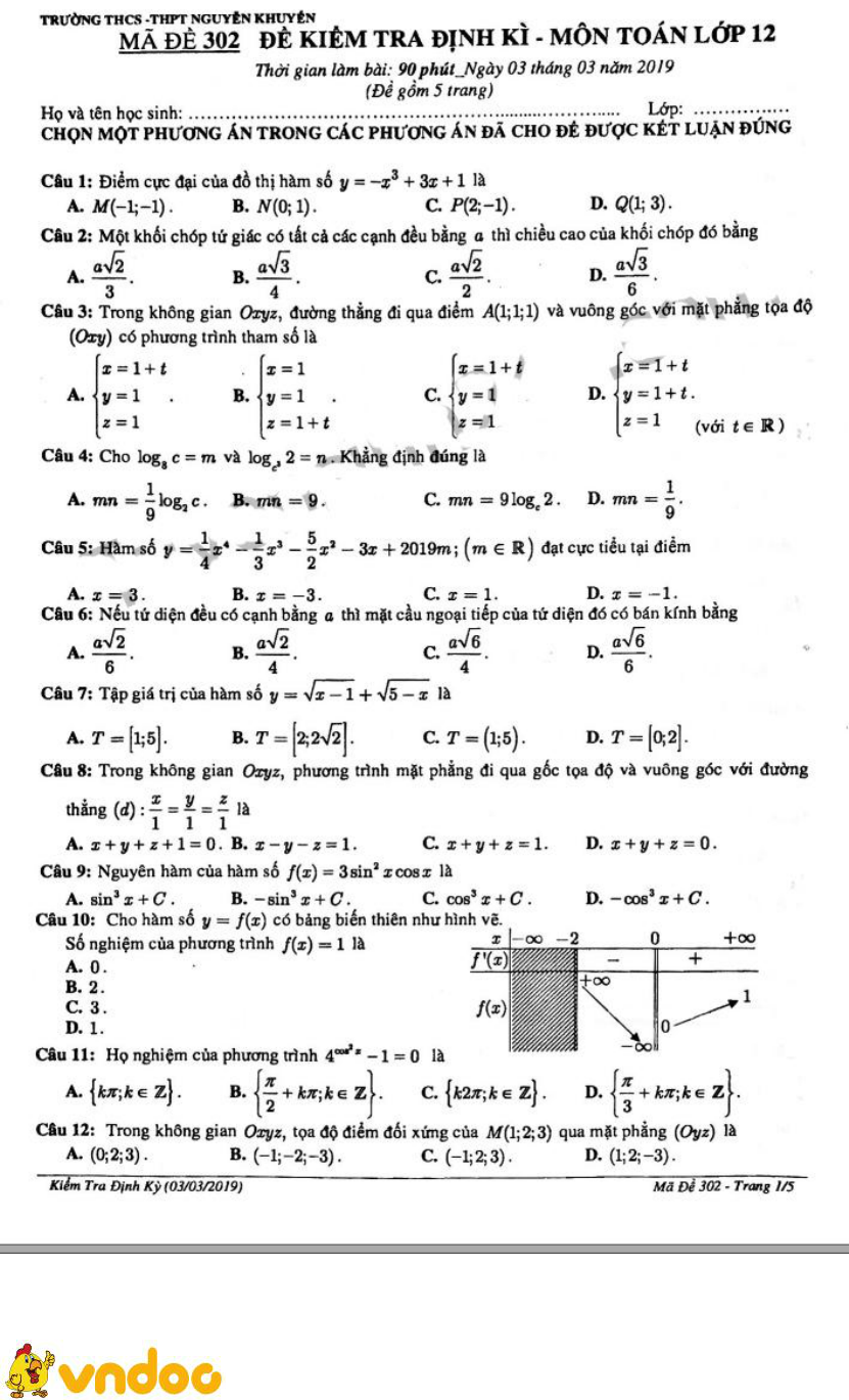 Đề thi giữa học kì 2 lớp 12 môn Toán năm 2018 - 2019 trường THPT Nguyễn Khuyến - TP. Hồ Chí Minh vừa được VnDoc.com sưu tập và xin gửi tới bạn đọc cùng tham khảo. Nội dung tài liệu gồm 50 câu hỏi trắc nghiệm, thời gian làm bài 90 phút, đề thi có đáp án. Mời các bạn học sinh tham khảo.
