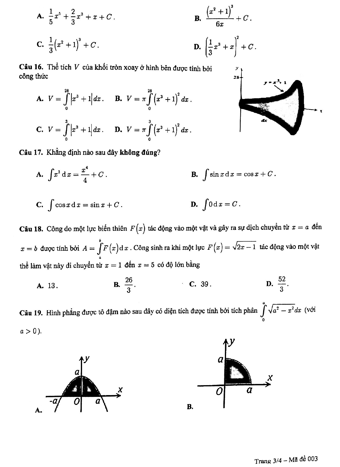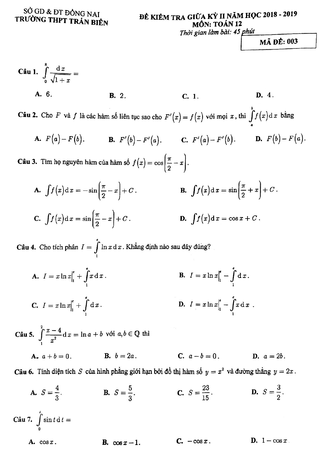 Đề thi giữa học kì 2 lớp 12 môn Toán năm 2018 - 2019 trường THPT Trấn Biên - Đồng Nai