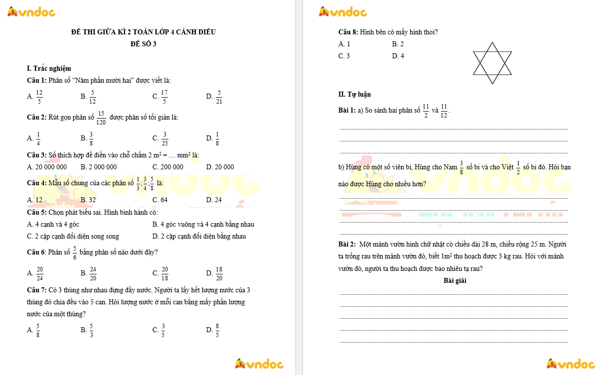 Đề thi giữa kì 2 lớp 4 môn Toán Cánh diều