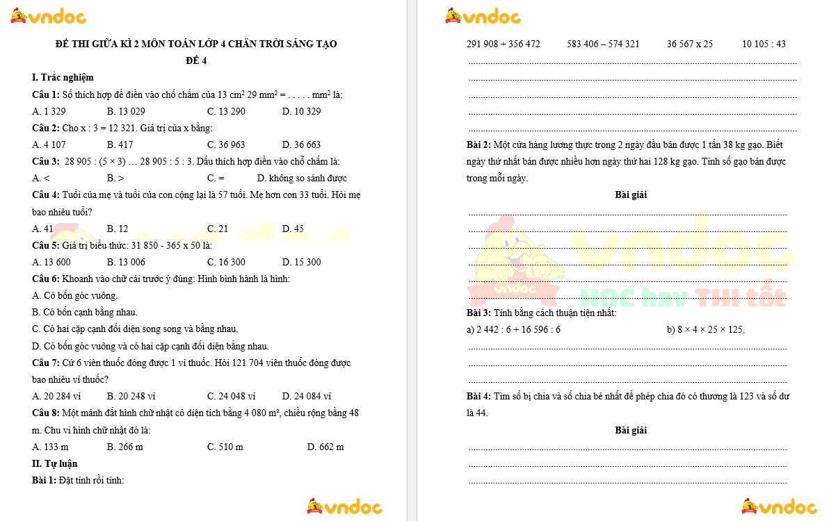 >> Tham khảo: Đề thi giữa học kì 2 lớp 4 môn Toán Chân trời sáng tạo - Đề số 5