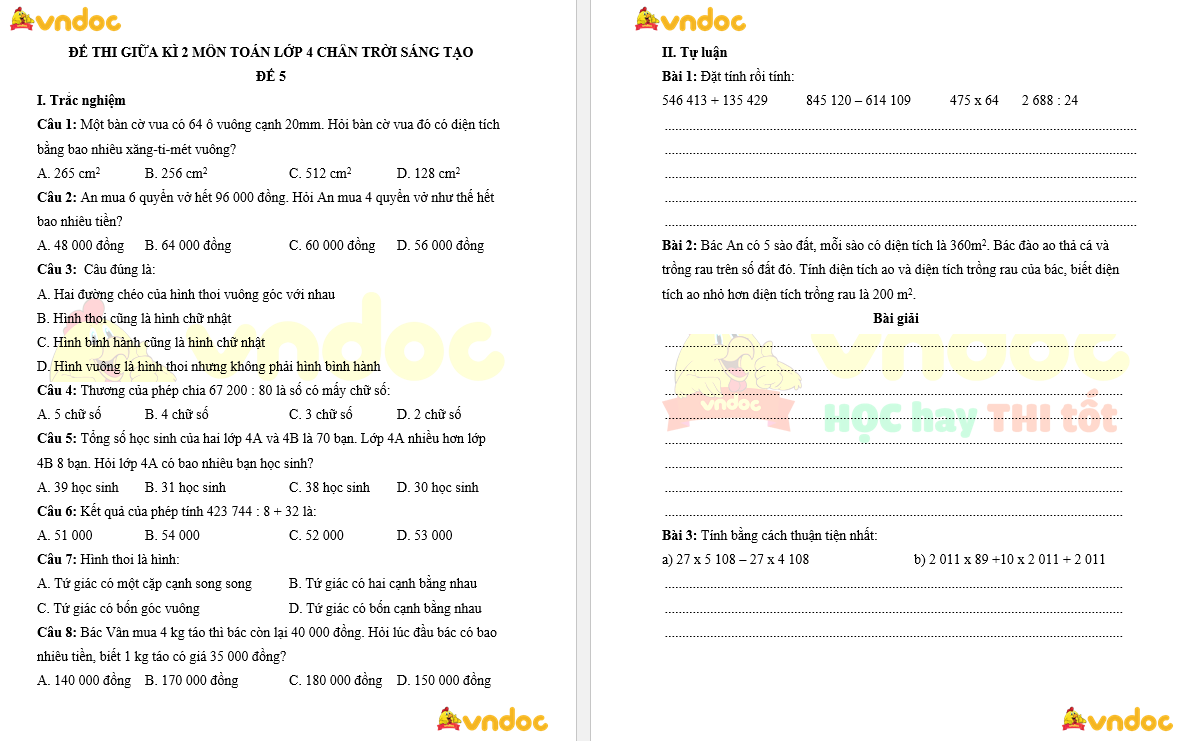 >> Tham khảo: Đề thi giữa kì 2 Toán lớp 4 Chân trời sáng tạo - Đề số 6