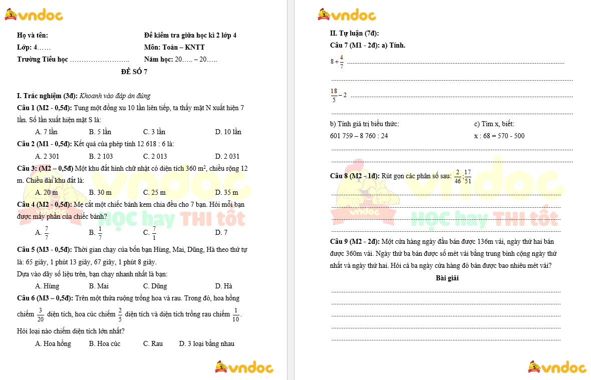 Đề thi giữa kì 2 lớp 4 môn Toán - Đề số 7 sách Kết nối tri thức được biên soạn nhằm giúp các em ôn tập và rèn luyện các kĩ năng làm bài kiểm tra để chuẩn bị cho kì thi giữa học kì 2 lớp 4. Đề thi gồm các dạng câu hỏi Trắc nghiệm và Bài tập được biên soạn bám sát chương trình học theo thông tư 27. Học sinh có thể làm bài trực tiếp vào đề mà không cần chuẩn bị thêm giấy ô li. Mời các em tham khảo tài liệu.