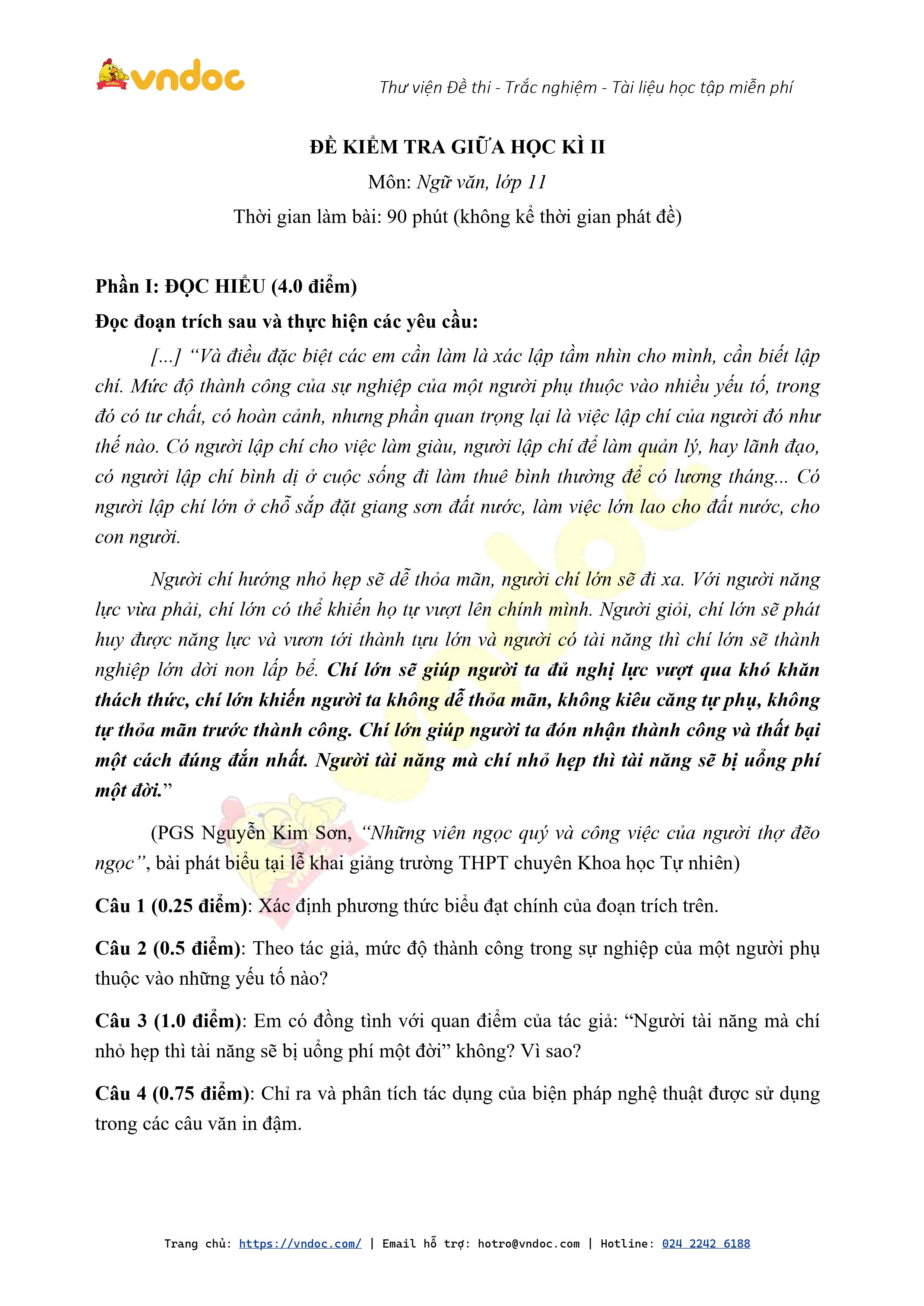 VnDoc.com vừa giới thiệu tới các bạn đọc Đề thi giữa học kì 2 lớp 11 môn Ngữ văn (đề số 4). Hi vọng qua bài viết các bạn sẽ có thêm tư liệu để ôn thi môn Ngữ văn 11 trong kì thi sắp tới. Các bạn có thể tham khảo thêm tuyển tập các đề thi giữa kì 2 lớp 11.