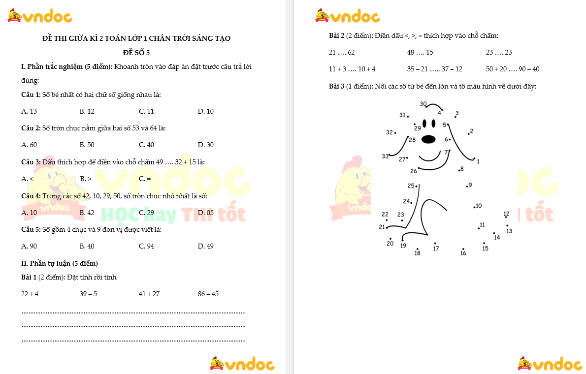 Tham khảo thêm: Bộ 5 đề thi giữa kì 2 môn Toán lớp 1 Chân trời sáng tạo