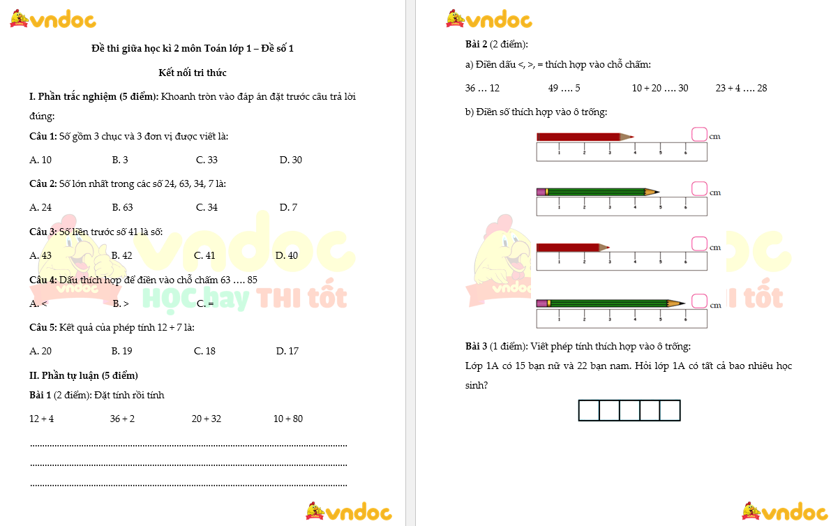 Đề thi giữa học kì 2 lớp 1 môn Toán - Đề số 1 Kết nối tri thức là tài liệu được VnDoc biên soạn giúp các em học sinh ôn luyện, củng cố kiến thức các dạng bài tập hay chuẩn bị cho bài thi giữa học kì 2 tốt nhất. Sau đây mời các em cùng tham khảo và tải về để ôn tập thi giữa kì lớp 1 đạt kết quả cao.