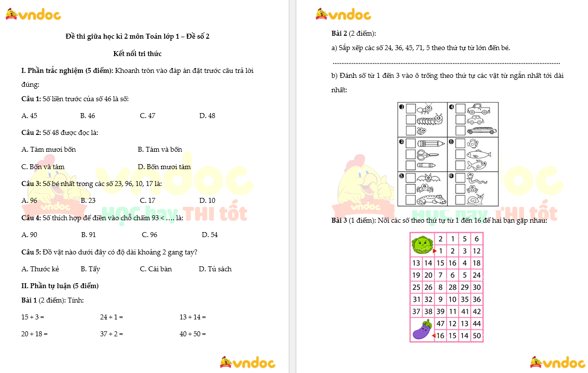 Đề thi giữa học kì 2 lớp 1 môn Toán - Đề số 2 Kết nối tri thức là tài liệu được VnDoc biên soạn giúp các em học sinh ôn luyện, củng cố kiến thức các dạng bài tập hay chuẩn bị cho bài thi giữa học kì 2 tốt nhất. Sau đây mời các em cùng tham khảo và tải về để ôn tập thi giữa kì lớp 1 đạt kết quả cao.