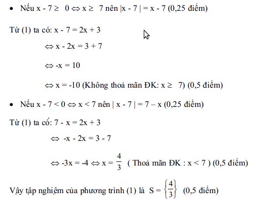 Câu 4: (2 điểm) Ta có: |x – 7| = 2x + 3 (1)