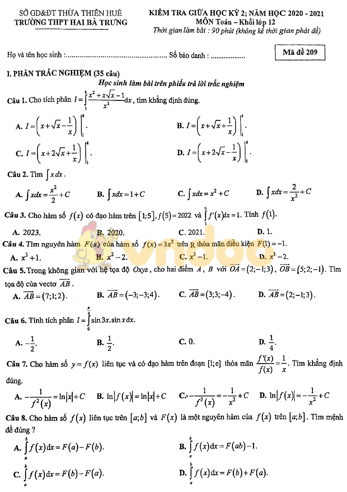 Mời các bạn tham khảo đề kiểm tra giữa kì 2 Toán 12 năm học 2020 - 2021 trường THPT Hai Bà Trưng, Thừa Thiên Huế do VnDoc sưu tầm và đăng tải sau đây. Đề kiểm tra Toán 12 gồm cả trắc nghiệm và tự luận có đầy đủ đáp án, là tài liệu hữu ích cho các em học sinh tham khảo, chuẩn bị cho kỳ thi giữa kì 2 sắp tới đạt kết quả cao.