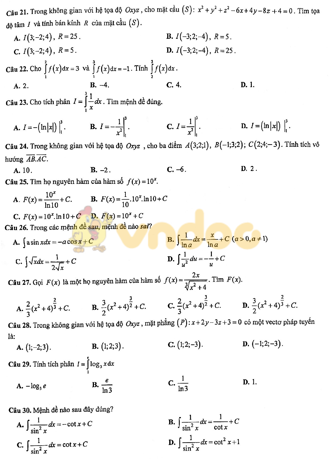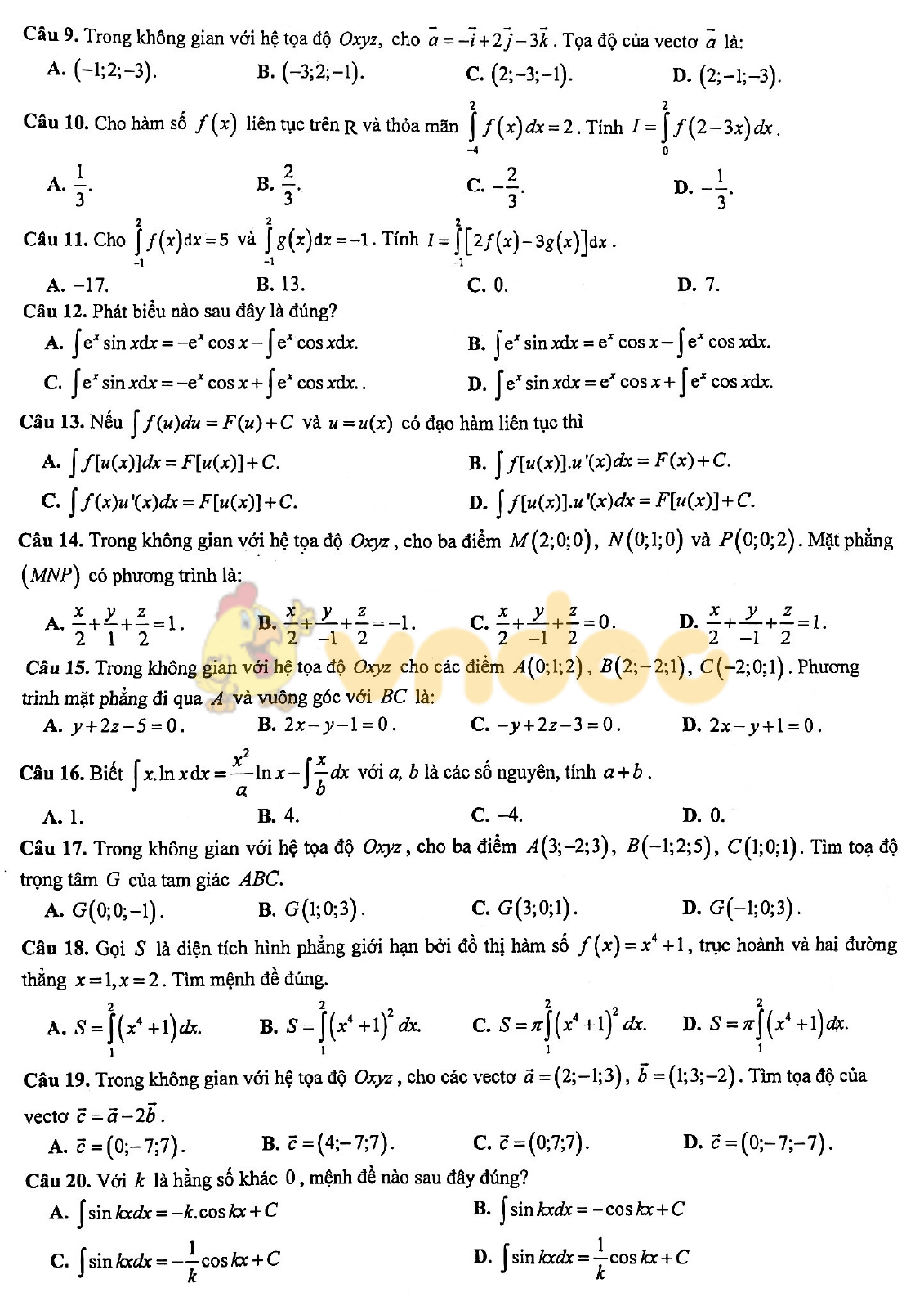 Đề thi giữa học kì 2 lớp 12 môn Toán năm 2020 - 2021
