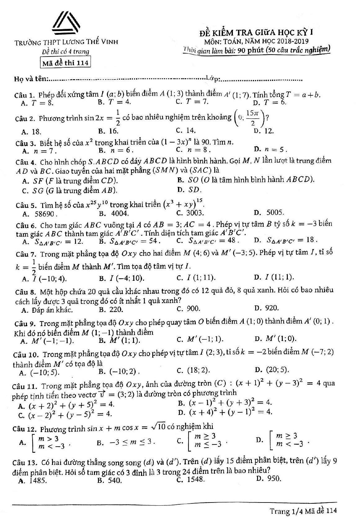Đề thi giữa kì 1 Toán 11 năm 2018 - 2019 trường THPT Lương Thế Vinh - Hà Nội
