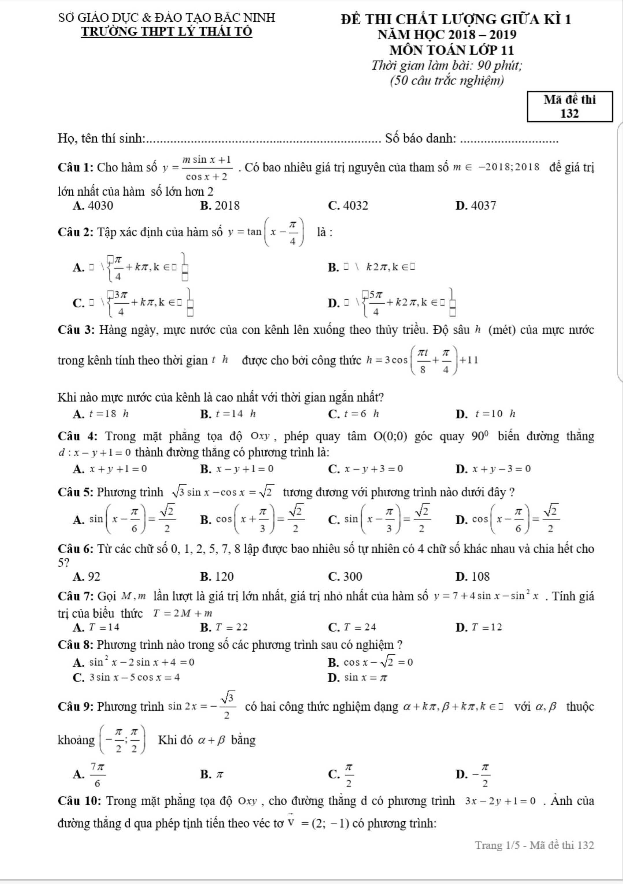 Đề thi giữa kì 1 Toán 11 năm 2018 - 2019 trường THPT Lý Thái Tổ - Bắc Ninh