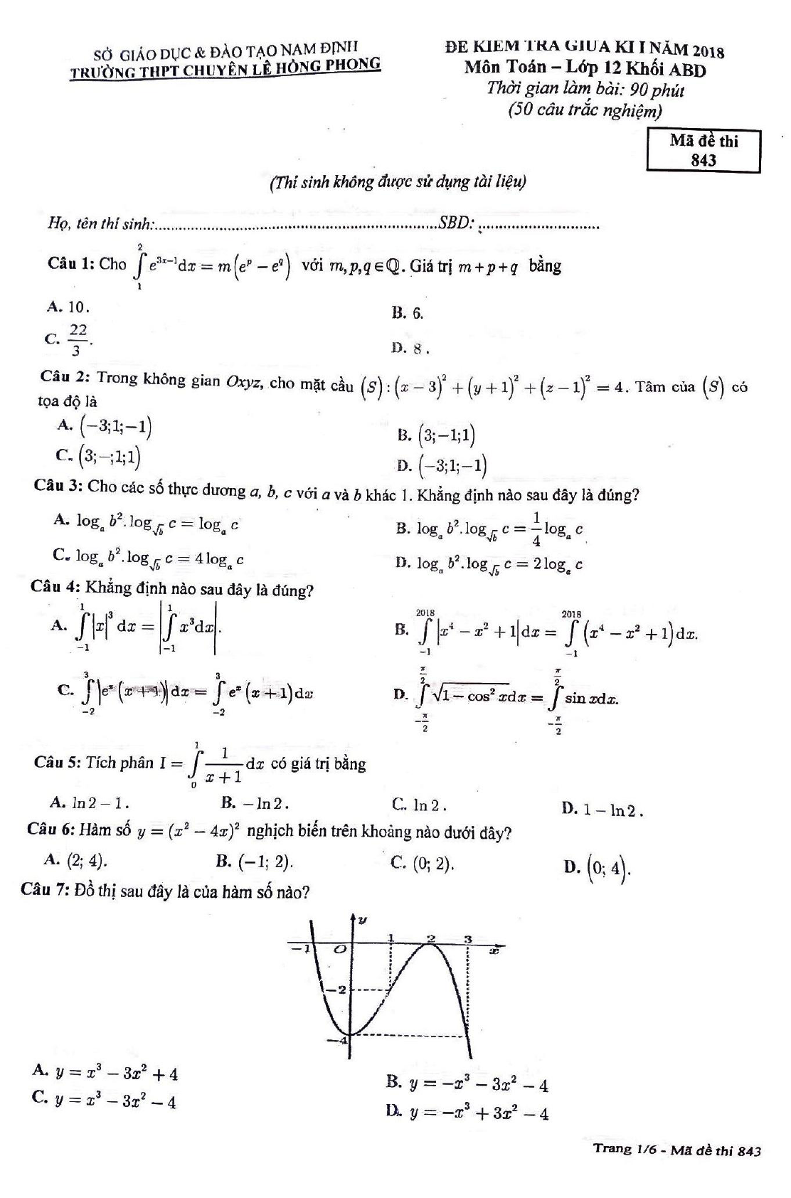 Đề thi giữa kì 1 Toán 12 năm 2018 - 2019 trường THPT chuyên Lê Hồng Phong - Nam Định
