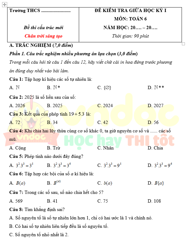 Đề thi giữa kì 1 môn Toán lớp 6 theo CV 7991