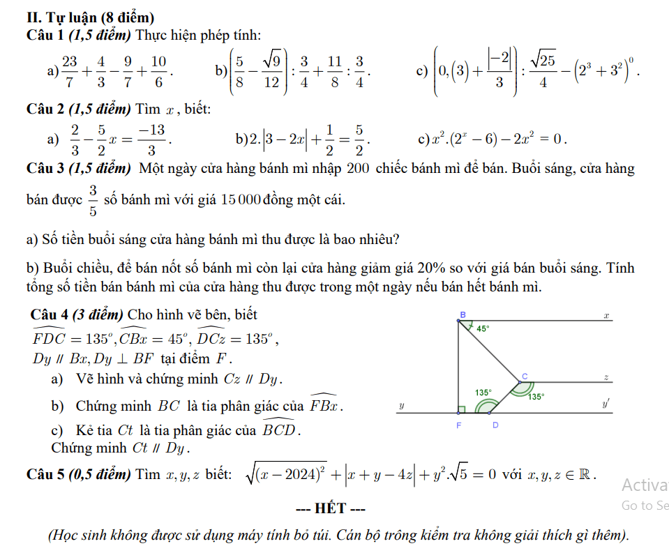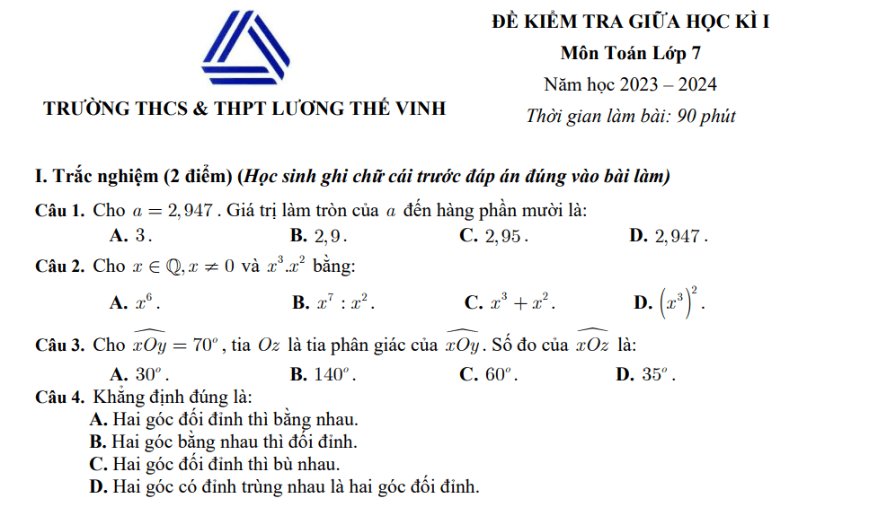 1. Đề thi giữa kì 1 Toán 7 trường Lương Thế Vinh, Hà Nội năm 2023 - 2024