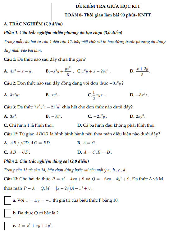 Đề thi giữa kì 1 môn Toán 8 - Đề 1 được biên soạn sát với nội dung sách giáo khoa Kết nối tri thức với cuộc sống (KNTT) với đầy đủ đề thi, đáp án và bảng ma trận. Đề thi này giúp các em học sinh tự đánh giá năng lực, rèn luyện kỹ năng giải các dạng bài trọng tâm về Đa thức, Hằng đẳng thức, Phân thức đại số và Tứ giác theo cấu trúc đề thi chính thức đồng thời hỗ trợ các thầy cô dễ dàng làm đề kiểm tra thử hoặc bài tập ôn luyện trên lớp. Mời tham khảo.