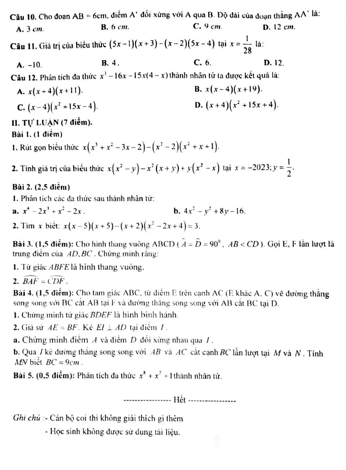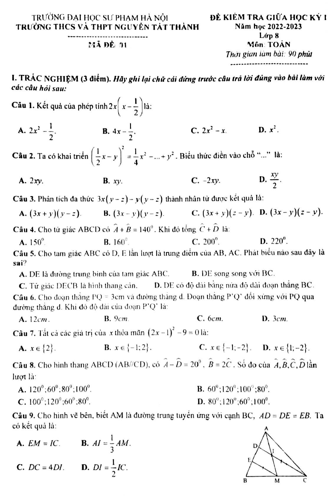VnDoc giới thiệu Đề thi giữa học kì 1 lớp 8 môn Toán 8 năm 2022 trường Nguyễn Tất Thành Hà Nội bao gồm cả trắc nghiệm và tự luận cho các em tham khảo và luyện tập. Đây không chỉ là tài liệu hay cho các em ôn luyện trước kỳ thi mà còn là tài liệu cho thầy cô tham khảo ra đề. Sau đây là nội dung đề thi mời thầy cô và các em tham khảo.