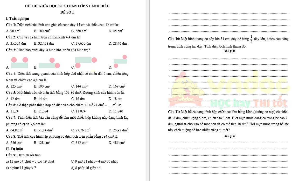 Đề thi giữa kì 2 lớp 5 môn Toán - Đề 1 sách Cánh diều do VnDoc biên soạn nhằm giúp các em ôn tập và rèn luyện các kĩ năng làm bài kiểm tra để chuẩn bị cho kì thi giữa kì 2 lớp 5. Đây là tài liệu hay cho thầy cô tham khảo ra đề và các em học sinh ôn luyện, chuẩn bị cho kì thi sắp tới đạt kết quả cao. Mời quý thầy cô và các em tham khảo tài liệu.