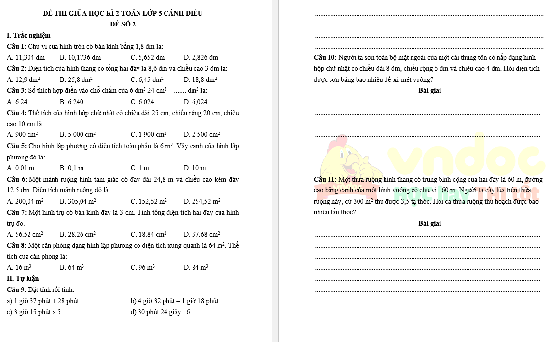 Đề thi giữa kì 2 môn Toán lớp 5 Cánh diều - Đề 2