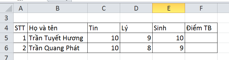b) Hãy viết công thức tính điểm trung bình ở ô F6