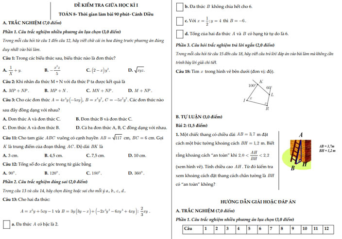 Đề thi Giữa kỳ I môn Toán 8 (kèm đáp án) theo sách Cánh diều được biên soạn kỹ lưỡng, đảm bảo chuẩn kiến thức.