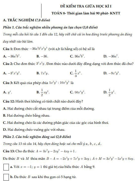 Đề kiểm tra Giữa kỳ I môn Toán 8 số 4 kèm đáp án chi tiết, biên soạn theo bộ sách Kết nối tri thức với cuộc sống, đảm bảo bám sát chương trình mới và chuẩn kiến thức – kỹ năng.