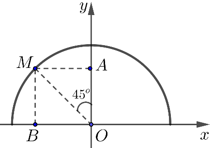 \(M\) nằm trên nửa đường tròn đơn vị như hình vẽ sau: