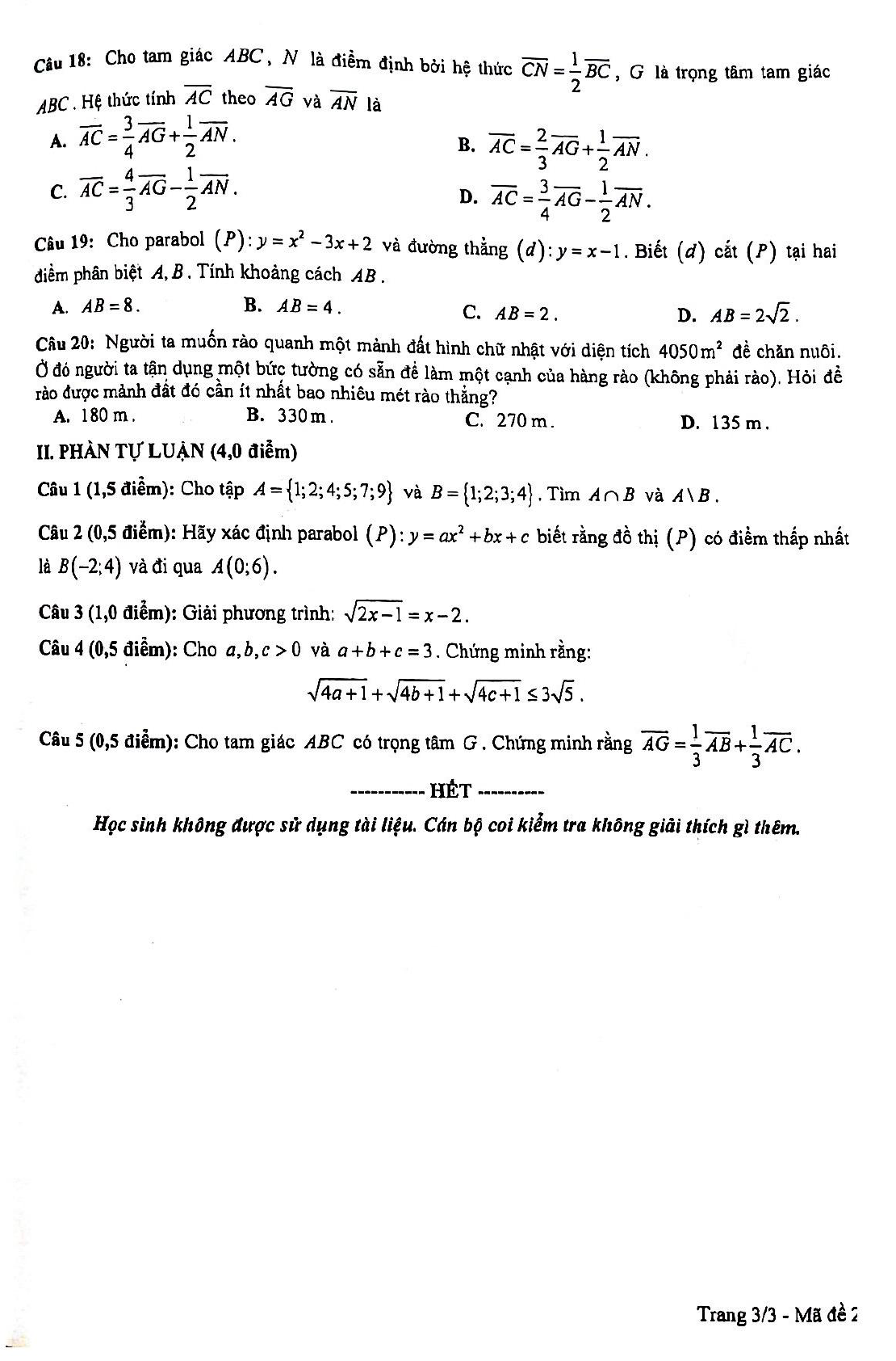 Đề thi học kì 1 lớp 10 môn Toán năm 2018 - 2019 Sở GD&ĐT Bạc Liêu