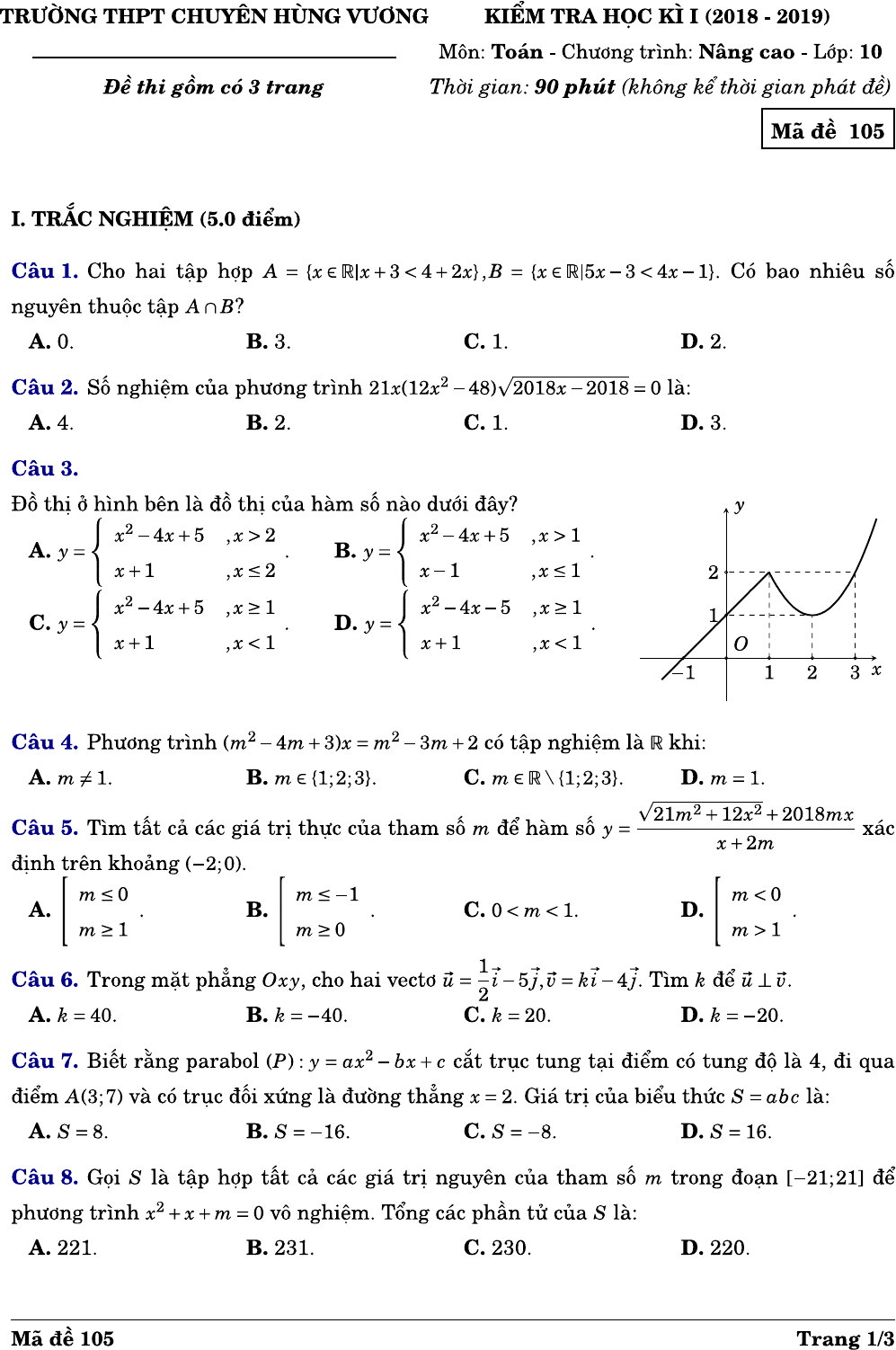 Đề thi học kì 1 lớp 10 môn Toán năm 2018 - 2019 trường THPT Chuyên Hùng Vương - Bình Dương