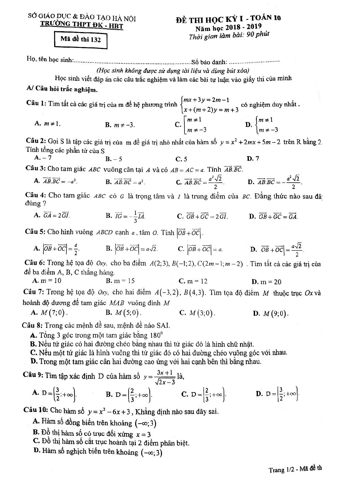 VnDoc mời các bạn học sinh tham khảo Đề thi học kì 1 lớp 10 môn Toán năm 2018 - 2019 trường THPT Đoàn Kết - Hà Nội. Tài liệu sẽ giúp các bạn rèn luyện giải Toán 10 nhanh và chính xác hơn. Mời các bạn tham khảo.