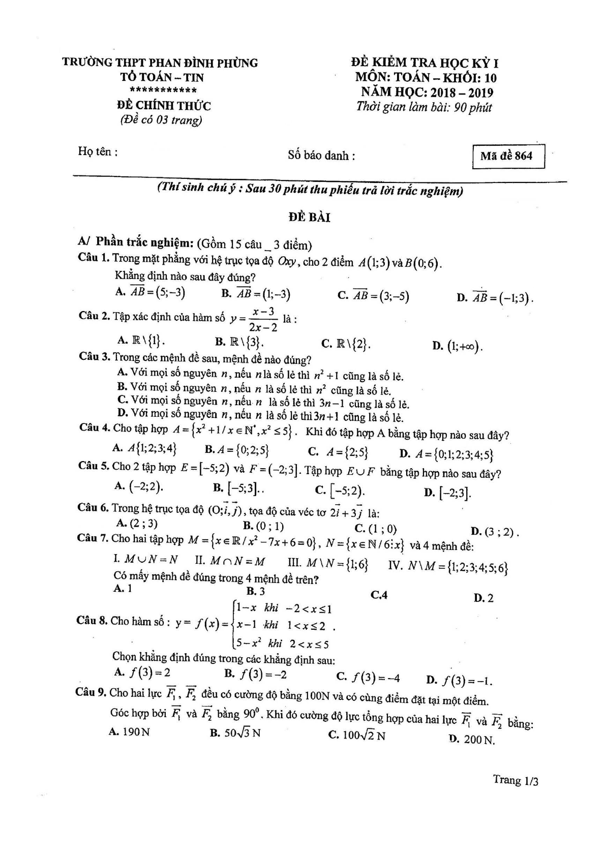 Đề thi học kì 1 lớp 10 môn Toán năm 2018 - 2019 trường THPT Phan Đình Phùng - Hà Nội