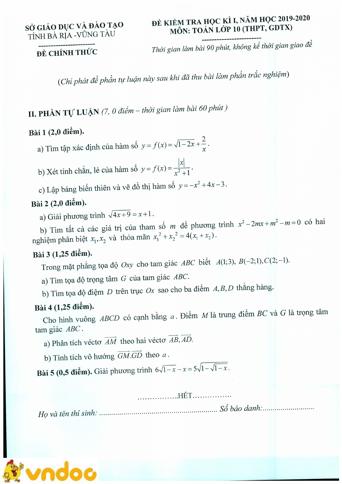 Đề thi học kì 1 lớp 10 môn Toán Sở GD&ĐT Bà Rịa - Vũng Tàu năm học 2019 - 2020 được VnDoc sưu tầm và đăng tải. Đây là kiểm tra học kì 1 lớp 10 môn Toán dành cho các bạn học sinh ôn tập, củng cố kiến thức, rèn luyện kĩ năng làm bài Toán. Mời các bạn cùng tham khảo