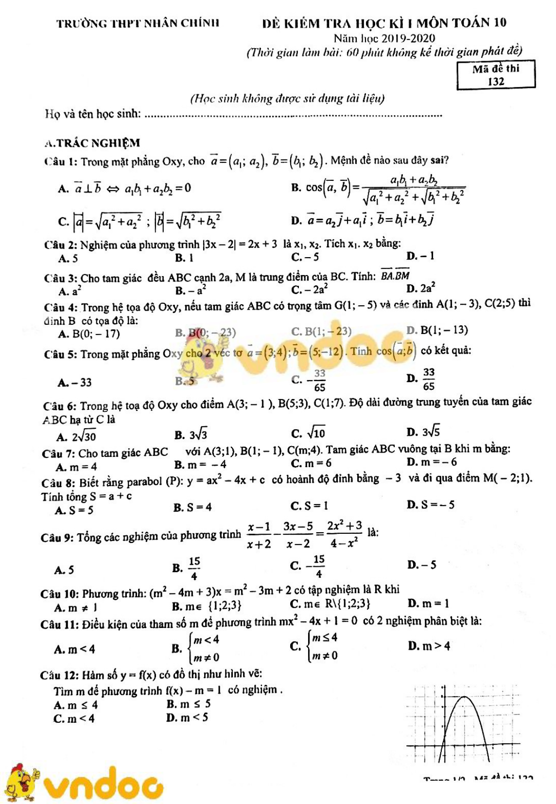 VnDoc xin giới thiệu tới các bạn Đề thi học kì 1 lớp 10 môn Toán Trường THPT Nhân Chính năm học 2019 - 2020. Đây là đề kiểm tra HK 1 lớp 10 môn Toán dành cho các bạn học sinh ôn tập, củng cố kiến thức, rèn luyện kĩ năng làm bài Toán. Mời các bạn cùng tham khảo