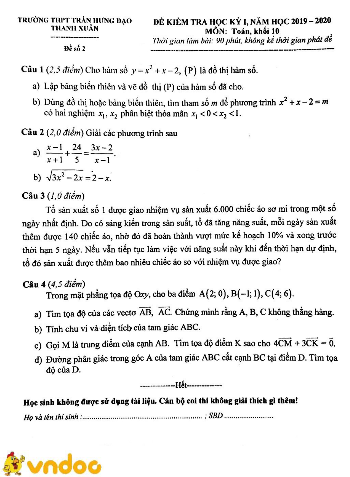 Đề thi học kì 1 lớp 10 môn Toán Trường THPT Trần Hưng Đạo, Thanh Xuân năm học 2019 - 2020 (đề 2)