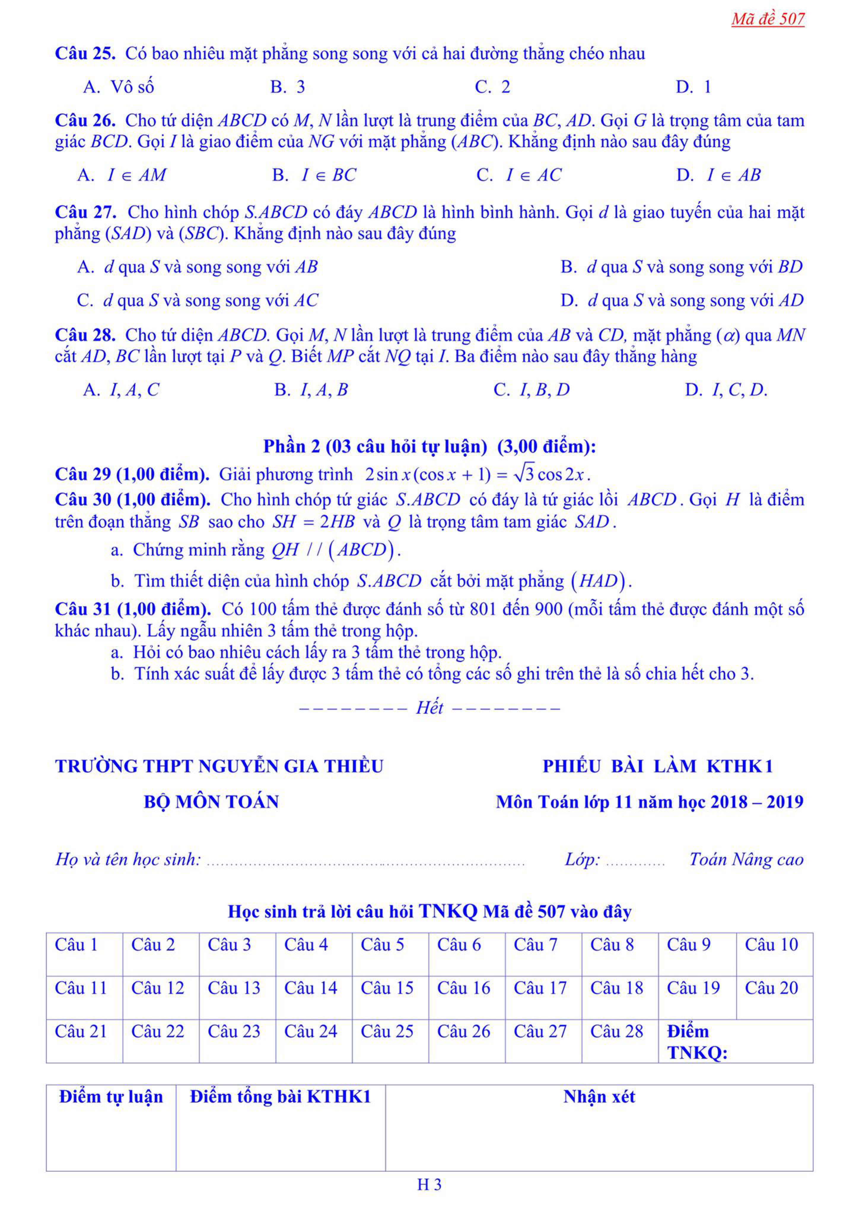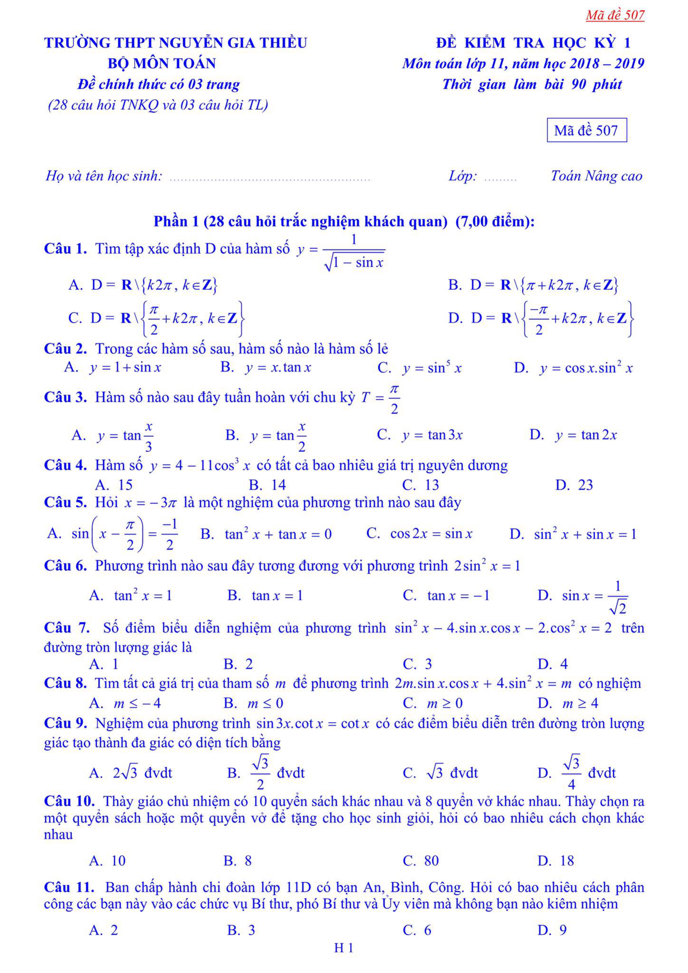 Đề thi học kì 1 lớp 11 môn Toán năm 2018 - 2019 trường Nguyễn Gia Thiều - Hà Nội