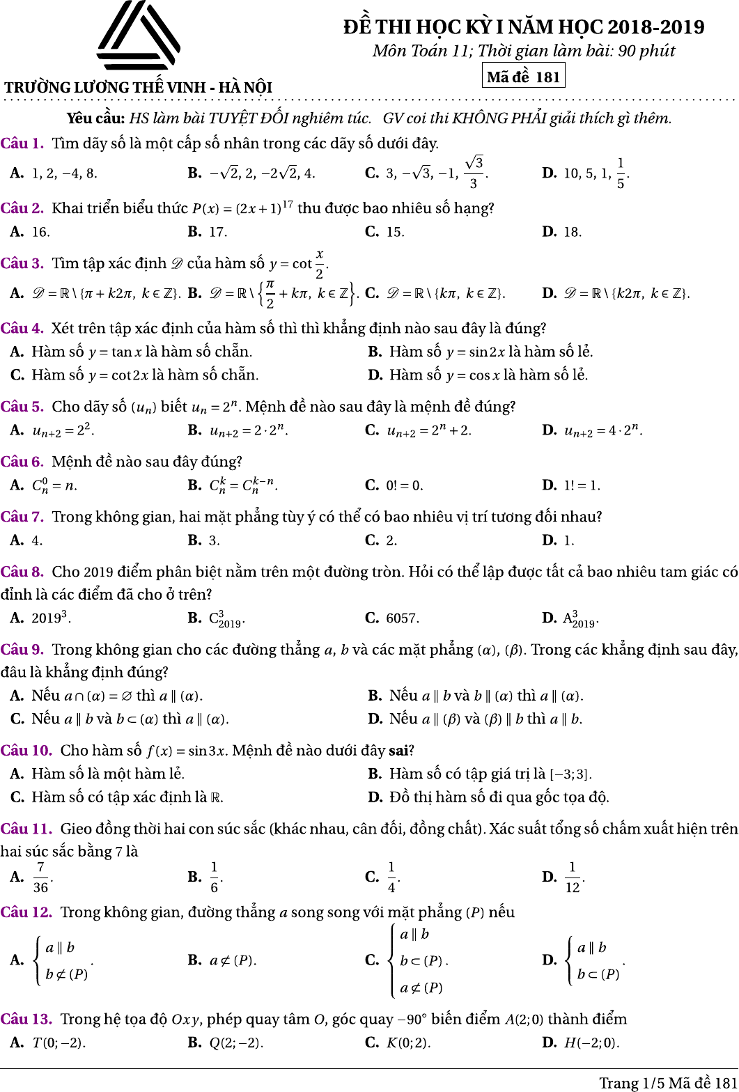 Đề thi học kì 1 lớp 11 môn Toán năm 2018 - 2019 trường THPT Lương Thế Vinh - Hà Nội