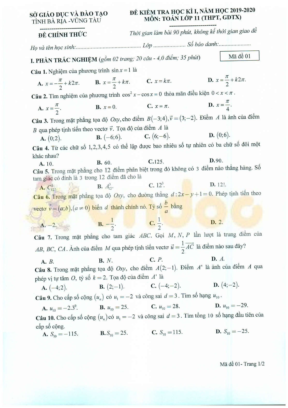 Đề thi học kì 1 lớp 11 môn Toán Sở GD&ĐT Bà Rịa - Vũng Tàu năm học 2019