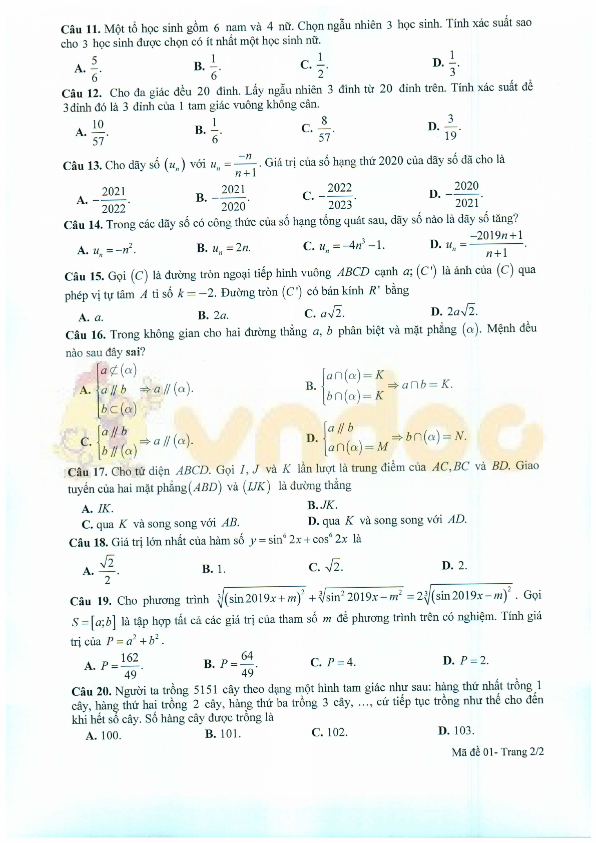 - Đề thi học kì 1 lớp 11 môn Toán trường THPT Chuyên Tiền Giang năm học 2019-2020