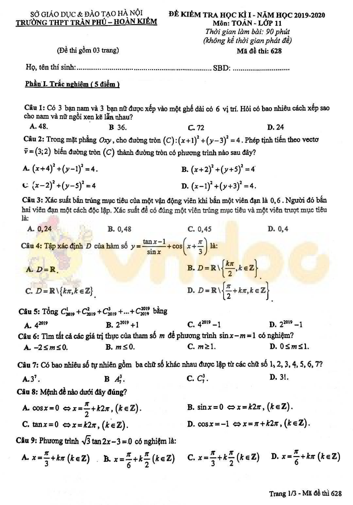 Đề thi học kì 1 lớp 11 môn Toán trường THPT Trần Phú, Hà Nội năm học 2019