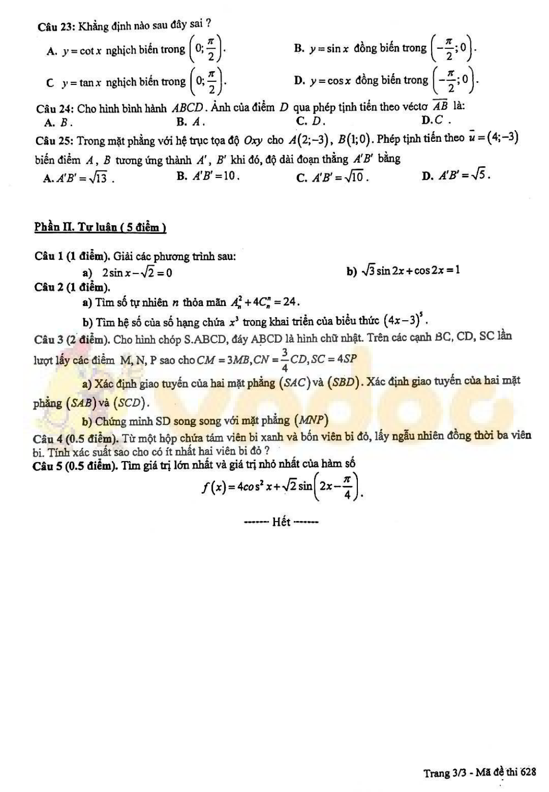 Đề thi học kì 1 lớp 11 môn Toán trường THPT Trần Phú, Hà Nội năm học 2019-2020 vừa được VnDoc.com sưu tập và xin gửi tới bạn đọc để bạn đọc cùng tham khảo. Đề thi gồm có 3 trang, tổng hợp 25 câu trắc nghiệm và 5 câu tự luận. Thí sinh làm đề trong thời gian 90 phút. Mời bạn đọc cùng tham khảo chi tiết tại đây.