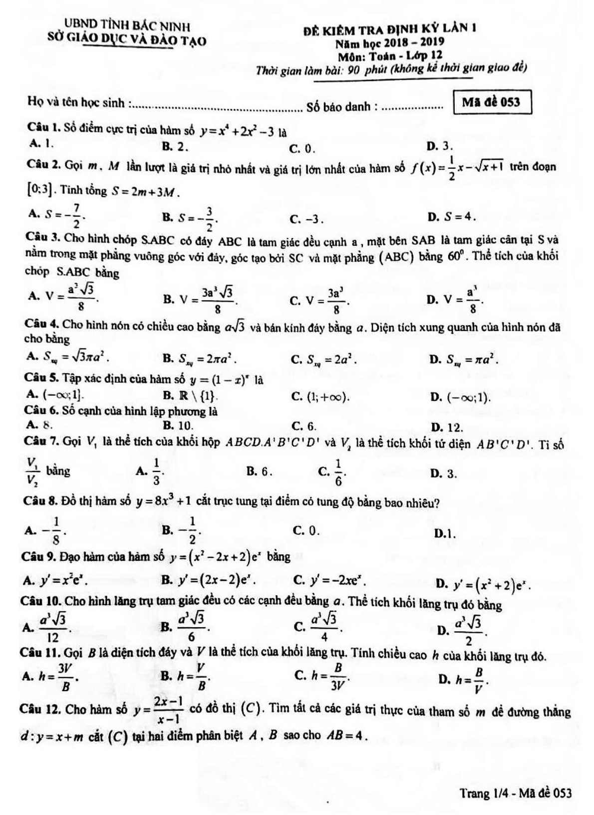 Đề thi học kì 1 lớp 12 môn Toán năm 2018 - 2019 Sở GD&ĐT Bắc Ninh