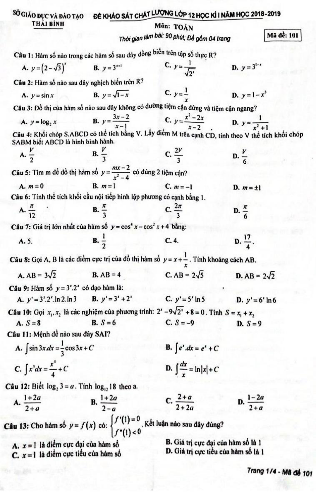 VnDoc xin giới thiệu tới bạn đọc Đề thi học kì 1 lớp 12 môn Toán năm 2018 - 2019 Sở GD&ĐT Thái Bình để bạn đọc cùng tham khảo và có thêm tài liệu ôn tập môn Toán nhé. Mời các bạn tham khảo.