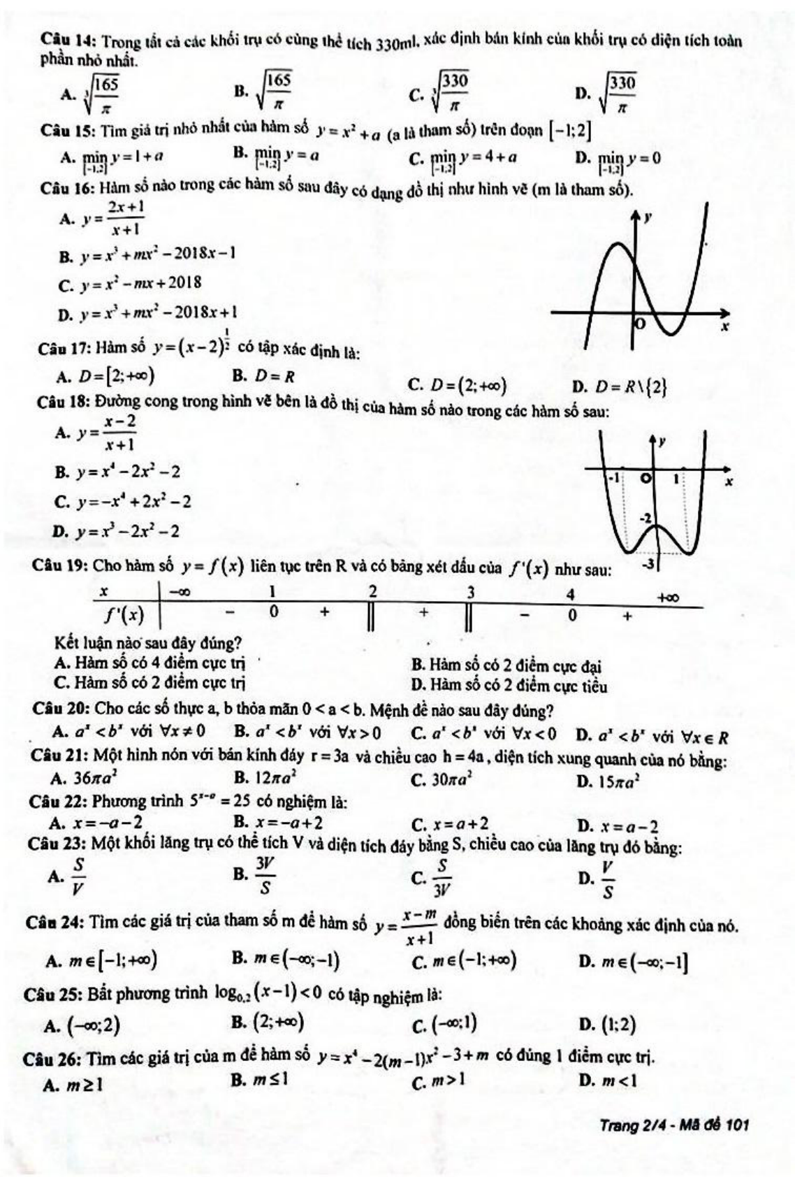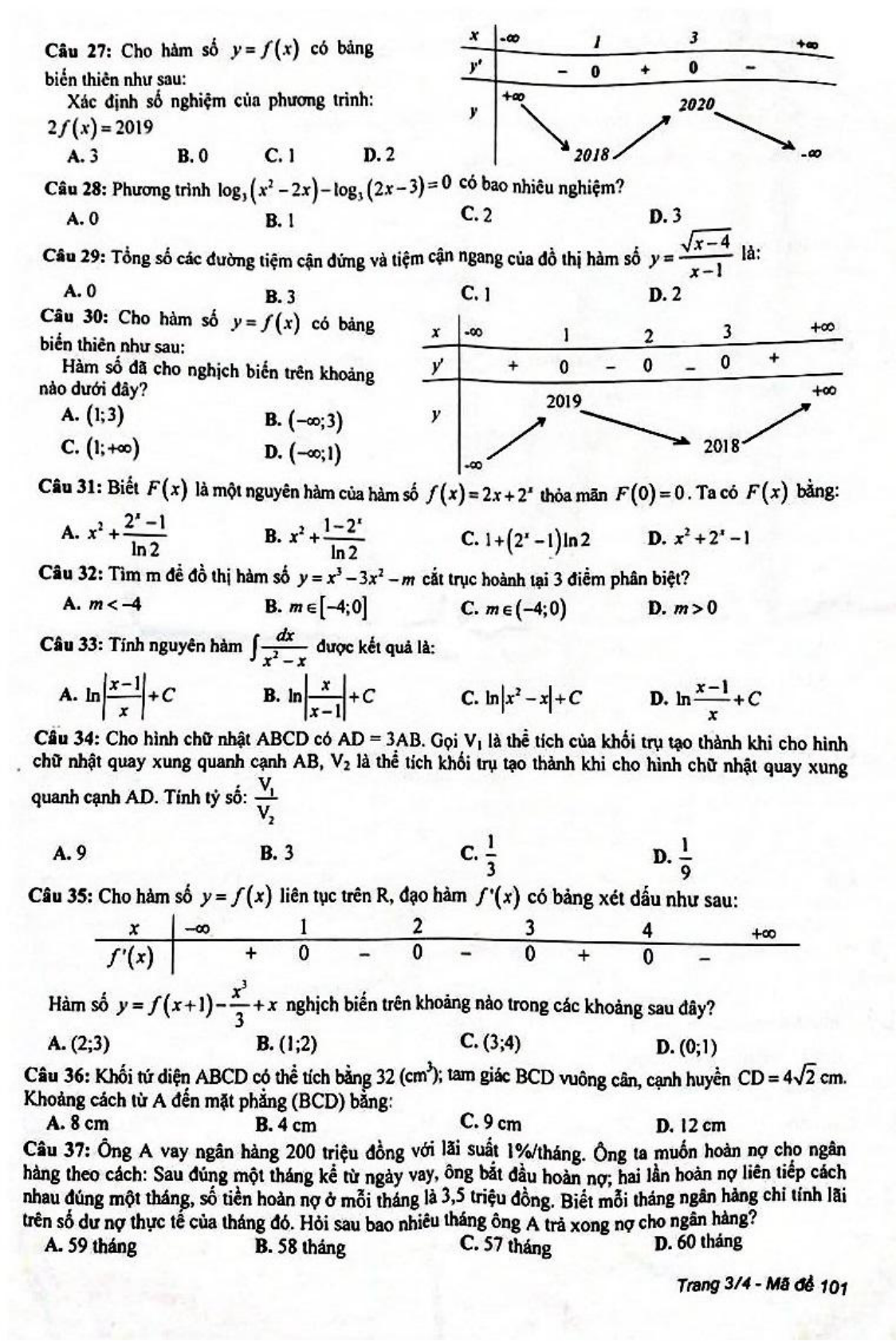 Đề thi học kì 1 lớp 12 môn Toán năm 2018 - 2019 Sở GD&ĐT Thái Bình vừa được VnDoc.com sưu tập và xin gửi tới bạn đọc để bạn đọc cùng tham khảo. Đề thi gồm 4 trang tổng hợp 50 câu trắc nghiệm làm trong thời gian 90 phút và có đáp án kèm theo được Sở Giáo dục và Đào tạo Thái Bình biên soạn. Mời bạn đọc cùng tham khảo chi tiết tại đây.