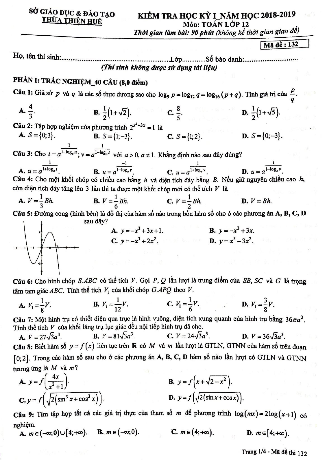 Đề thi học kì 1 lớp 12 môn Toán năm 2018 - 2019 Sở GD&ĐT Thừa Thiên Huế