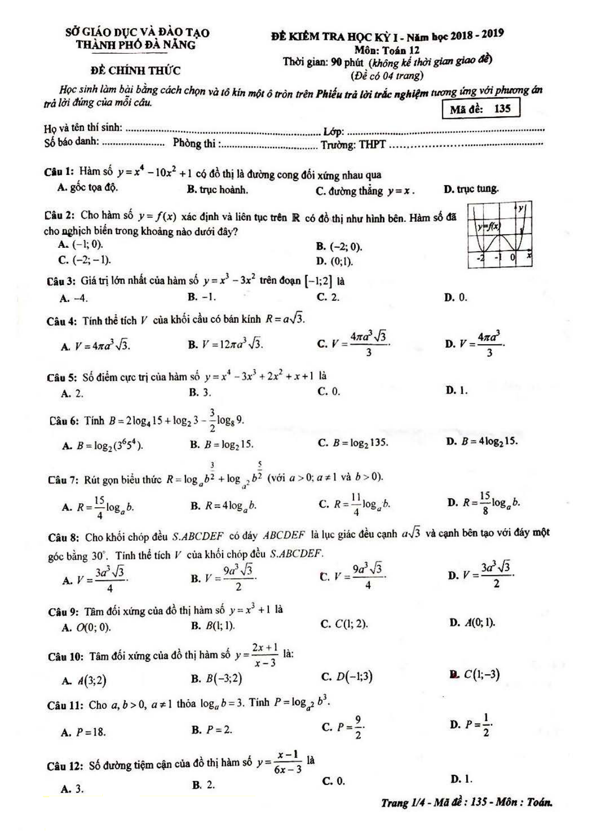 Đề thi học kì 1 lớp 12 môn Toán năm 2018 - 2019 Sở GD&ĐT TP Đà Nẵng