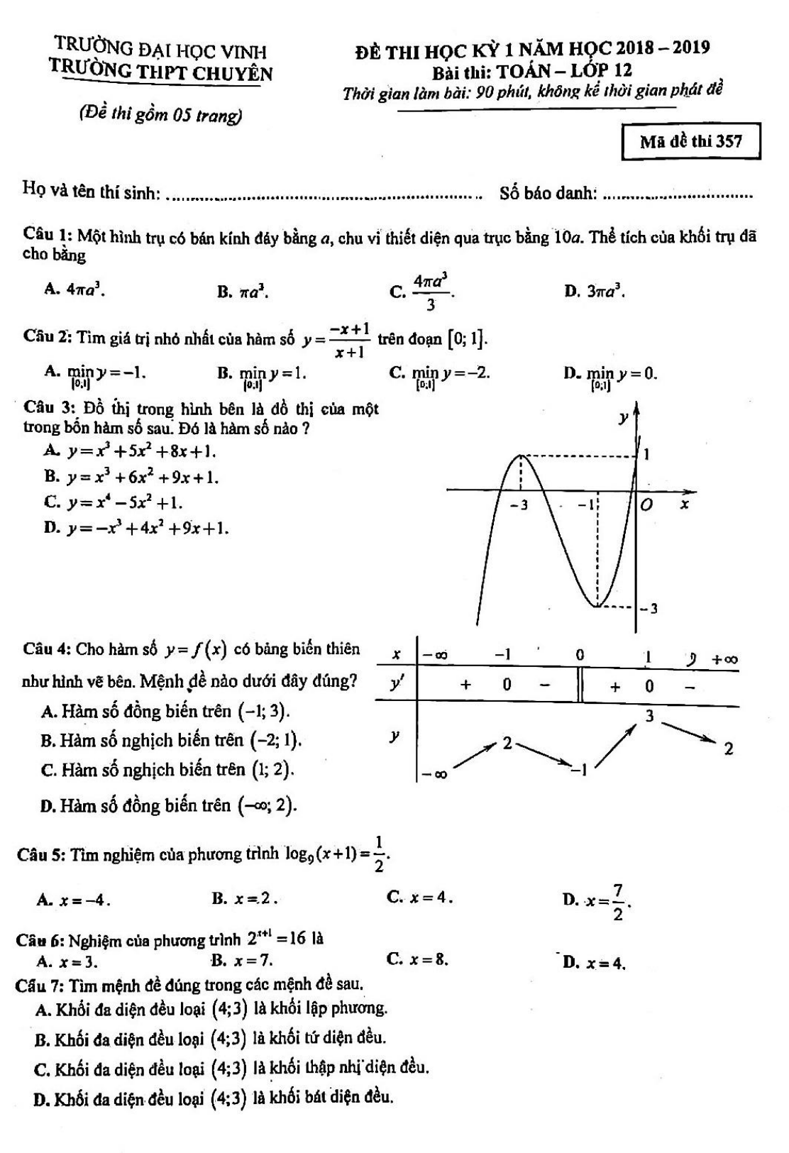 Đề thi học kì 1 lớp 12 môn Toán năm 2018 - 2019 trường THPT Chuyên Đại học Vinh - Nghệ An
